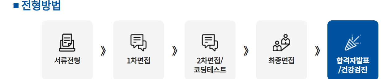 - 어학 성적 우대: TOEIC 730, TOEFL(iBT) 79, TEPS 368 만점 - 1차 필기 시험: NCS 직업 기초 시험 - 2차 필기 시험 - 전공 시험 - 논술 - 1차 면접 전형 - 실무진, 외부위원 개별 면접, 집단 토론 - 2차 면접 전형 - 임원, 외부위원 개별 면접