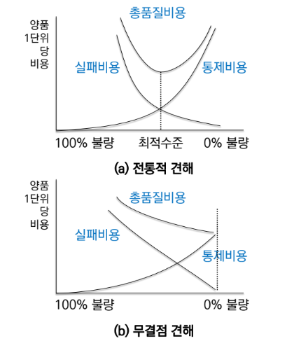 전통적 견해: 최적 수준을 위해 일정량의 불량은 허용해야 한다고 봄무결점 견해: 통제비용이 올라가는 속도보다 실패비용이 감소하는 속도가 더 빠르기 때문에 품질 수준을 계속 높여야 한다고 봄