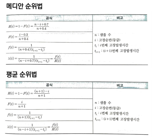 • 평균 순위법의 분모가 n+1인 이유는 안전장치를 둬서 샘플이 다 고장나도 아직 수명이 다 끝나지 않았다는 것을 고려