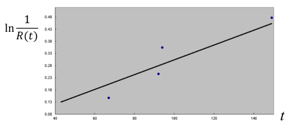 • \(R(t) = e^{-λt} -> \frac{1}{R(t)} = e^{λt} -> ln(\frac{1}{R(t)}) = λt\)
