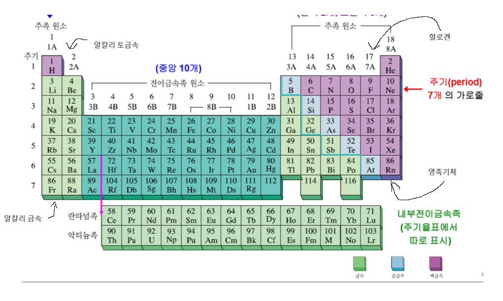 알칼리 금속: 은빛 금속, 물과 빠르게 반응하여 다른 원소(기름)와 결합해서 존재알칼리 토금속: 광택이 있는 은빛 금속. 여전히 순수한 상태로 존재하지 않지만 알칼리 금속보다 덜 반응적할로겐: 색이 있고, 부식성인 비금속. 역시 다른 원소와 결합해서 존재영족 기체: 무색의 반응성이 매우 작은 기체.금속: 수은 제외 모두 실온에서 고체.전도체준금속: 실온에서 고체이지만 부서지기 쉽고 가공이 어려움.반도체비금속: 11가지가 기체, 1개(브로민) 액체, 5개 고체(탄소, 인, 황, 셀레늄, 아이오딘). 고체는 역시 가공이 어려우며,낮은 전도성