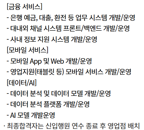 - 신입 행원 연수: 약 1년 이내 영업점 근무 후, 유관 부서 및 본부 부서 배치. 인력 운영 및 업무상 필요에 따라 변동될 수 있음