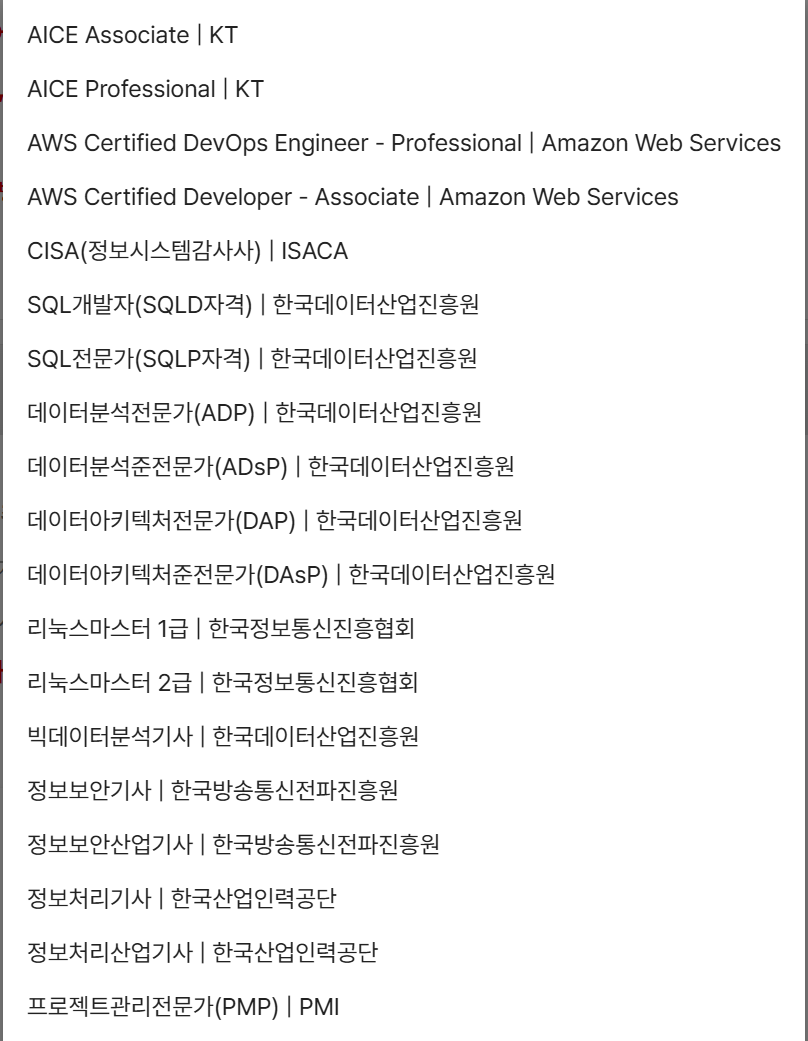 - 전공 학술: 소프트웨어공학, 데이터베이스, 컴퓨터구조, 데이터통신, 정보보호, 운영체제, 자료구조, 인공지능, 기계학습