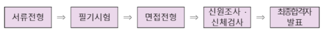 - 어학 성적 우대: TOEIC 730, TOEFL(iBT) 79, TEPS 368 만점 - 1차 필기 시험: NCS 직업 기초 시험 - 2차 필기 시험 - 전공 시험 - 논술 - 1차 면접 전형 - 실무진, 외부위원 개별 면접, 집단 토론 - 2차 면접 전형 - 임원, 외부위원 개별 면접