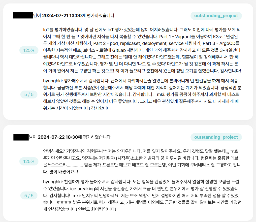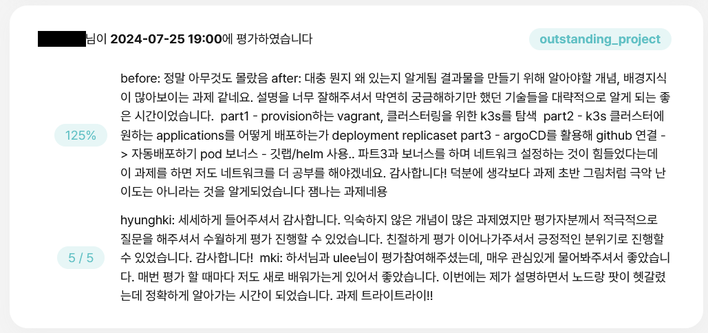 k8s의 개략적인 개념을 적용해보기 좋은 과제였던것 같습니다. 왠지 이 과제를 발판으로 삼아 더 응용할만한 과제가 있을법 한데, 의외로 후속 과제가 없는것이 조금 아쉬웠습니다. 개인적으로 조금 더 깊이 있는 infra 분야의 심화 과제가 많이 나왔으면 좋겠네요.