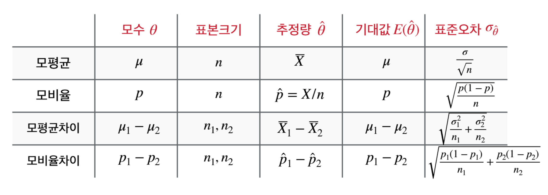 • 모평균, 모비율의 차이는 서로 독립이라는 가정이 필요하다.