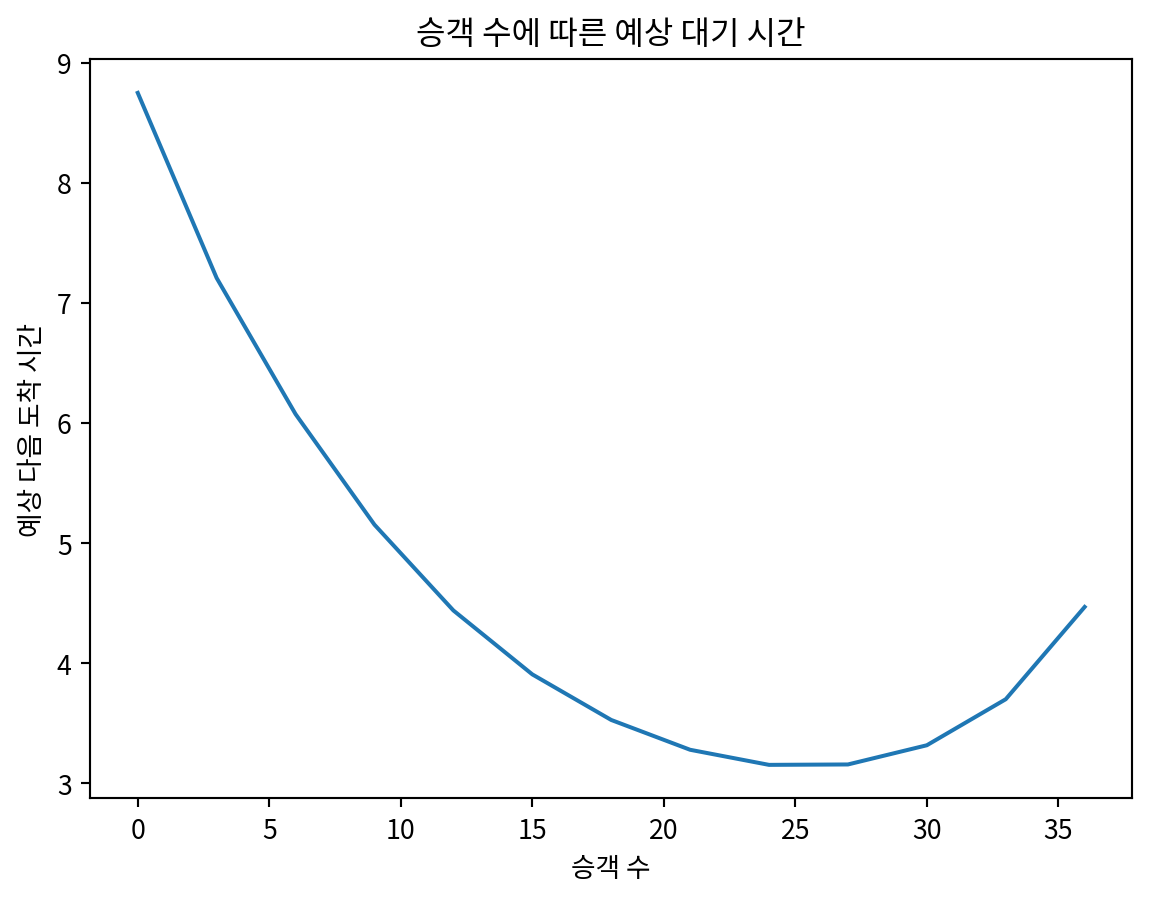 plt.title('승객 수에 따른 예상 대기 시간')