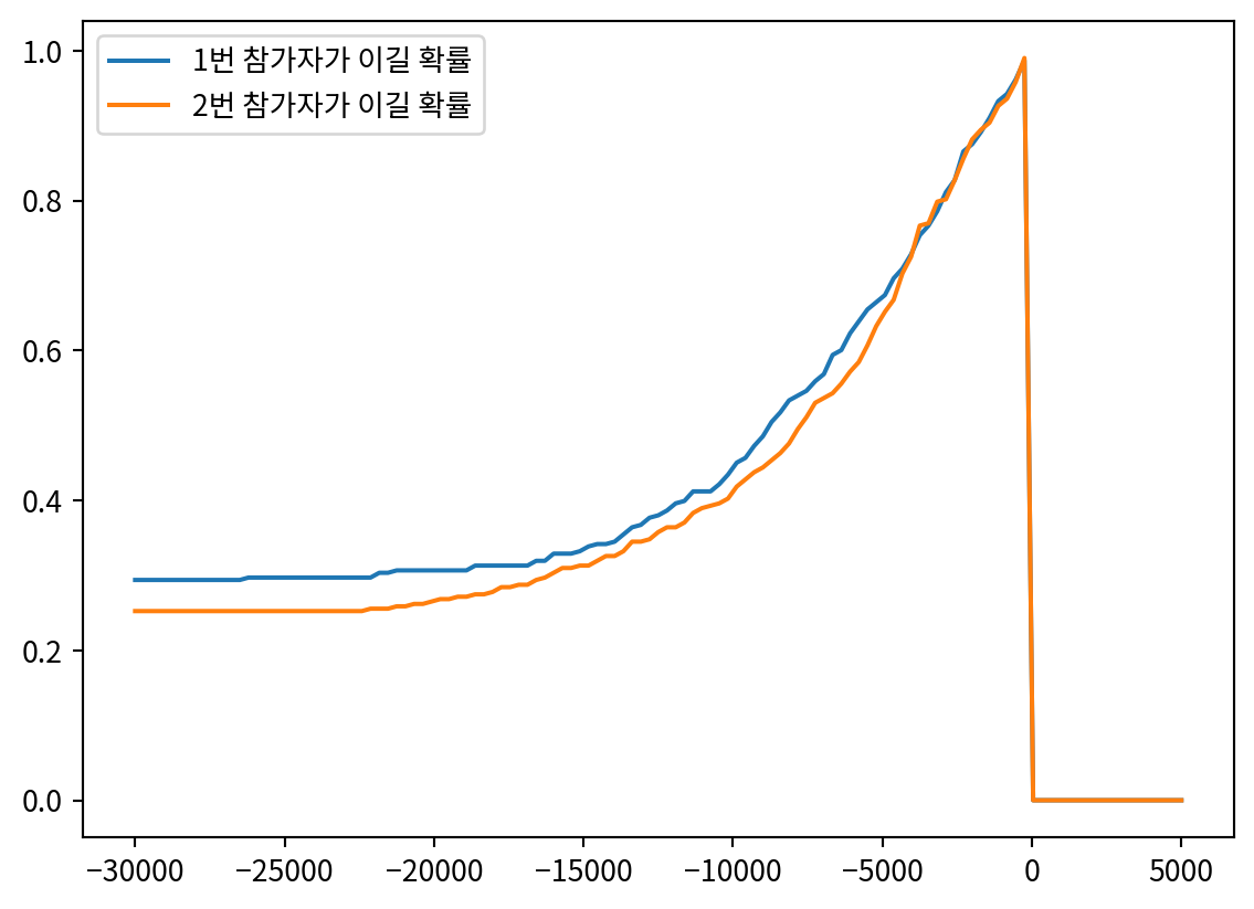plt.plot(xs, ys2, label='2번 참가자가 이길 확률')