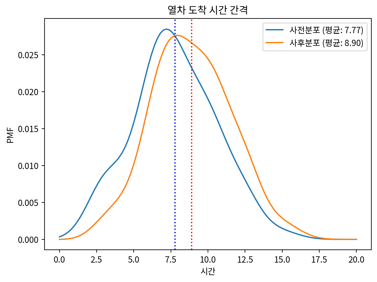 Text(0.5, 1.0, '10명이 기다리고 있는것을 관찰한 이전과 이후 분포')