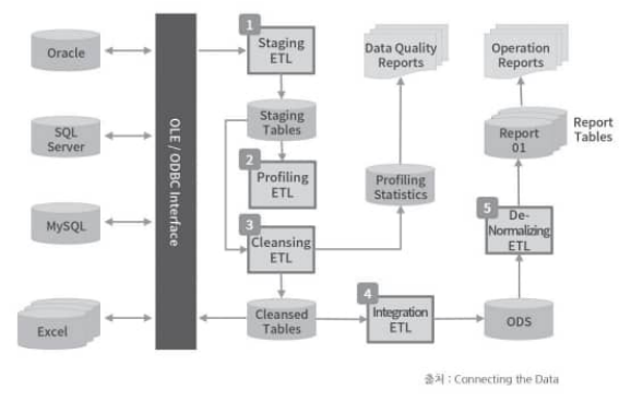 Interface: 다양한 소스로부터 데이터 휙득을 위한 인터페이스(OLEDB, ODBC, FTP)Staging: 정기적으로 데이터 원천으로 부터 저장. 아직은 정규화 xProfiling: staging table의 데이터 특성을 식별하고, 품질 측정Cleansing: profiling된 데이터를 보정Integration: 데이터 충돌을 해소하고, 데이터를 통합. 아마 여기서 정규화가 이루어질듯(왜 책에 설명 똑바로 안해놓지)Export: 운영보고서 생성, 데이터웨어하우스 / 데이터마트에 적재하기 위한 최적화(denormalization) 진행
