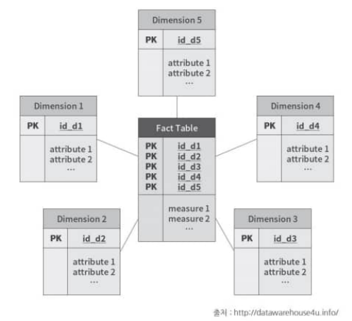 스타 스키마(조인 스키마)- 제 3정규형의 fact 테이블과 제 2정규형의 차원 테이블로 구성
