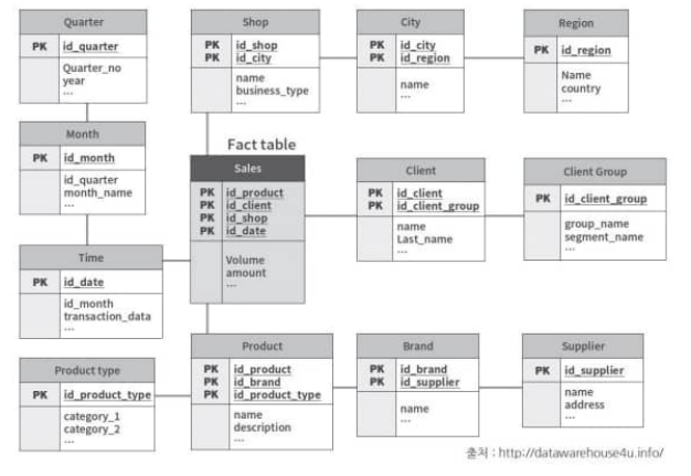 스노우플레이크 스키마- 스타 스키마의 차원 테이블을 제 3정규형으로 정규화한 상태