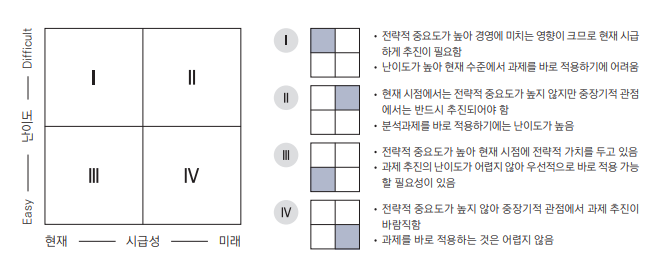 위 기준에 따라 시급성과 난이도를 평가한 후, 아래 그림에 맞게 우선순위를 정한다.