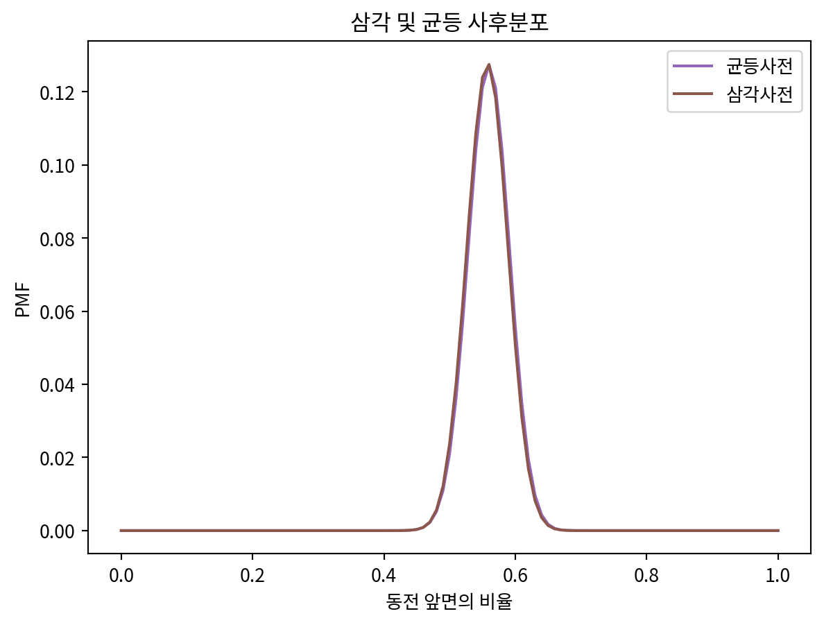 plt.title('삼각 및 균등 사후분포')