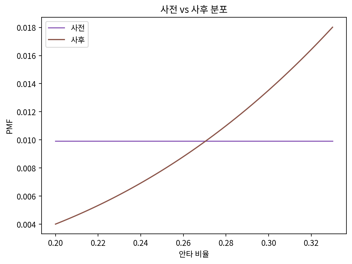 plt.title('사전 vs 사후 분포')