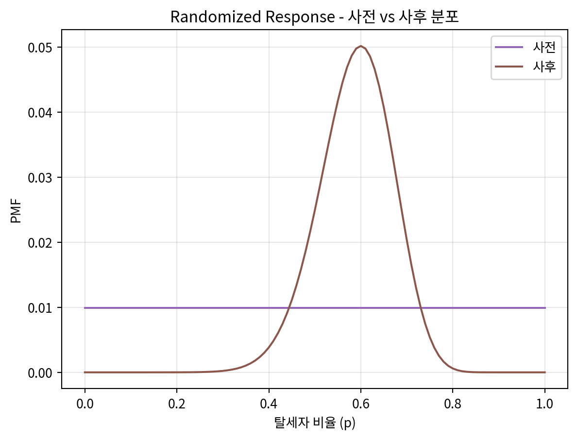 plt.title('Randomized Response - 사전 vs 사후 분포')