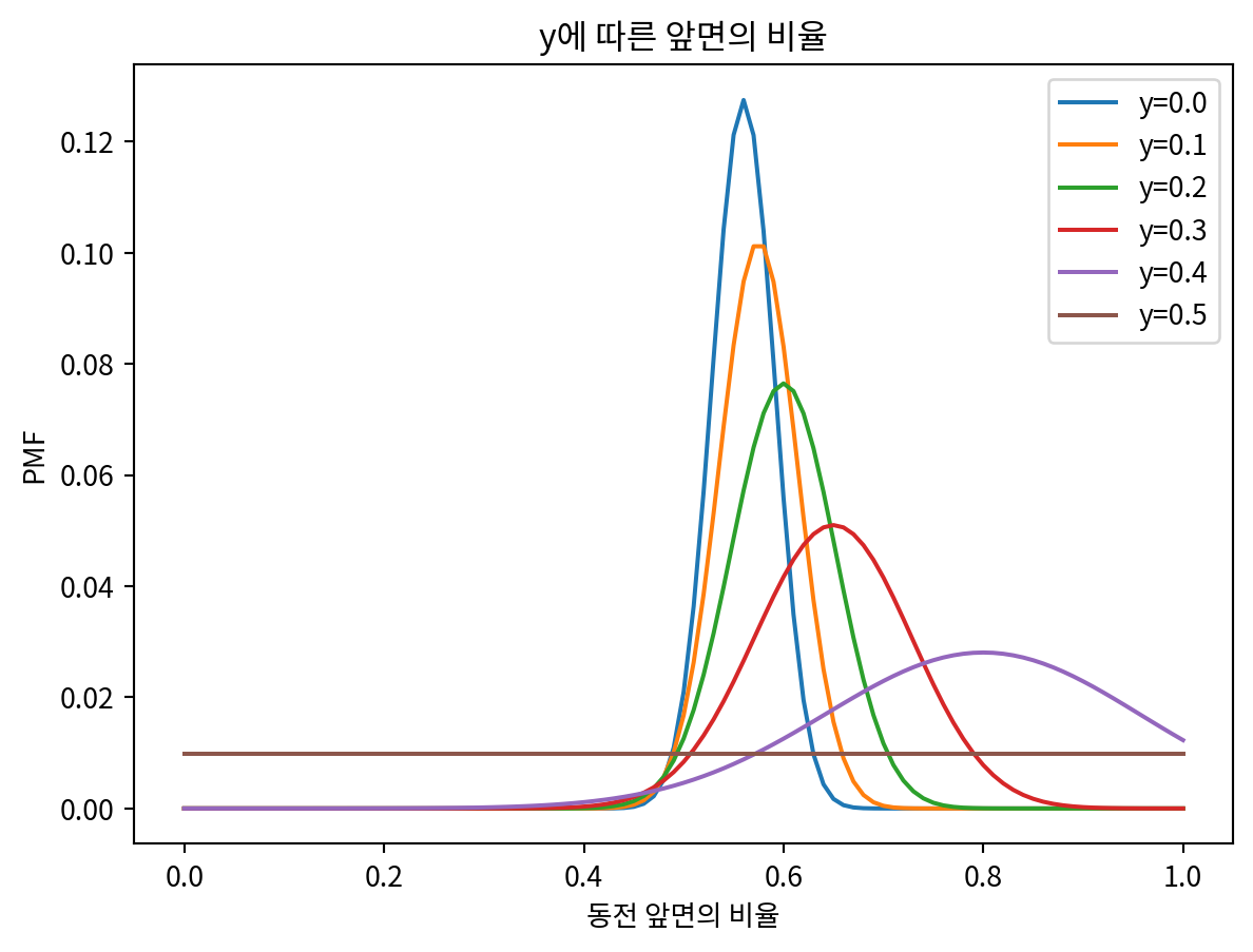 • 동전 앞면의 비율을 균등분포로 가정하고 시작