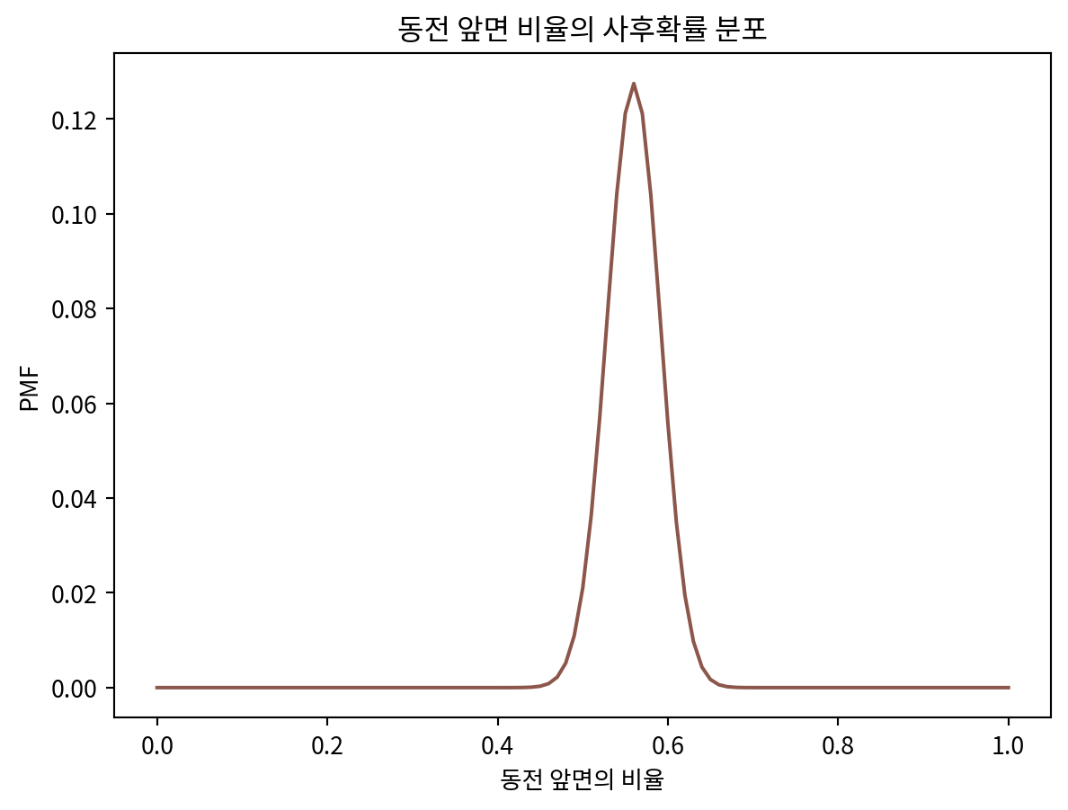 plt.title('동전 앞면 비율의 사후확률 분포')
