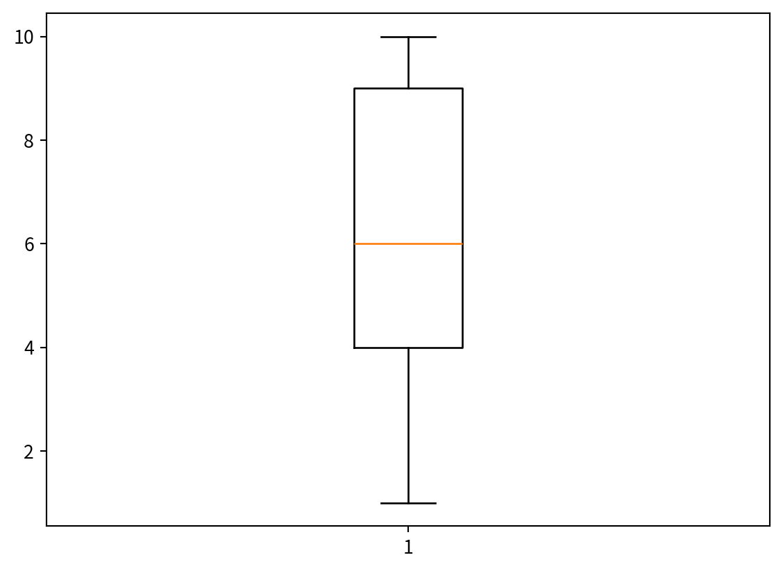 print(f'분산: {np.var(df, ddof=1)}, 표준편차: {np.std(df, ddof=1)}, 범위: {np.ptp(df)}, 1,3분위수: {np.quantile(df, [0.25, 0.75])}, 변동계수: {np.std(df, ddof=1) / np.mean(df)}')