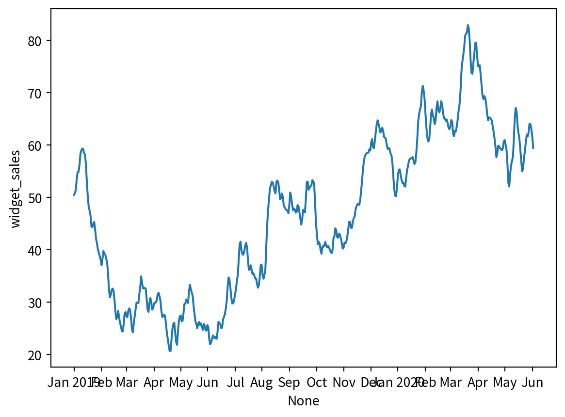 sns.lineplot(data=df, x=df.index, y='widget_sales')