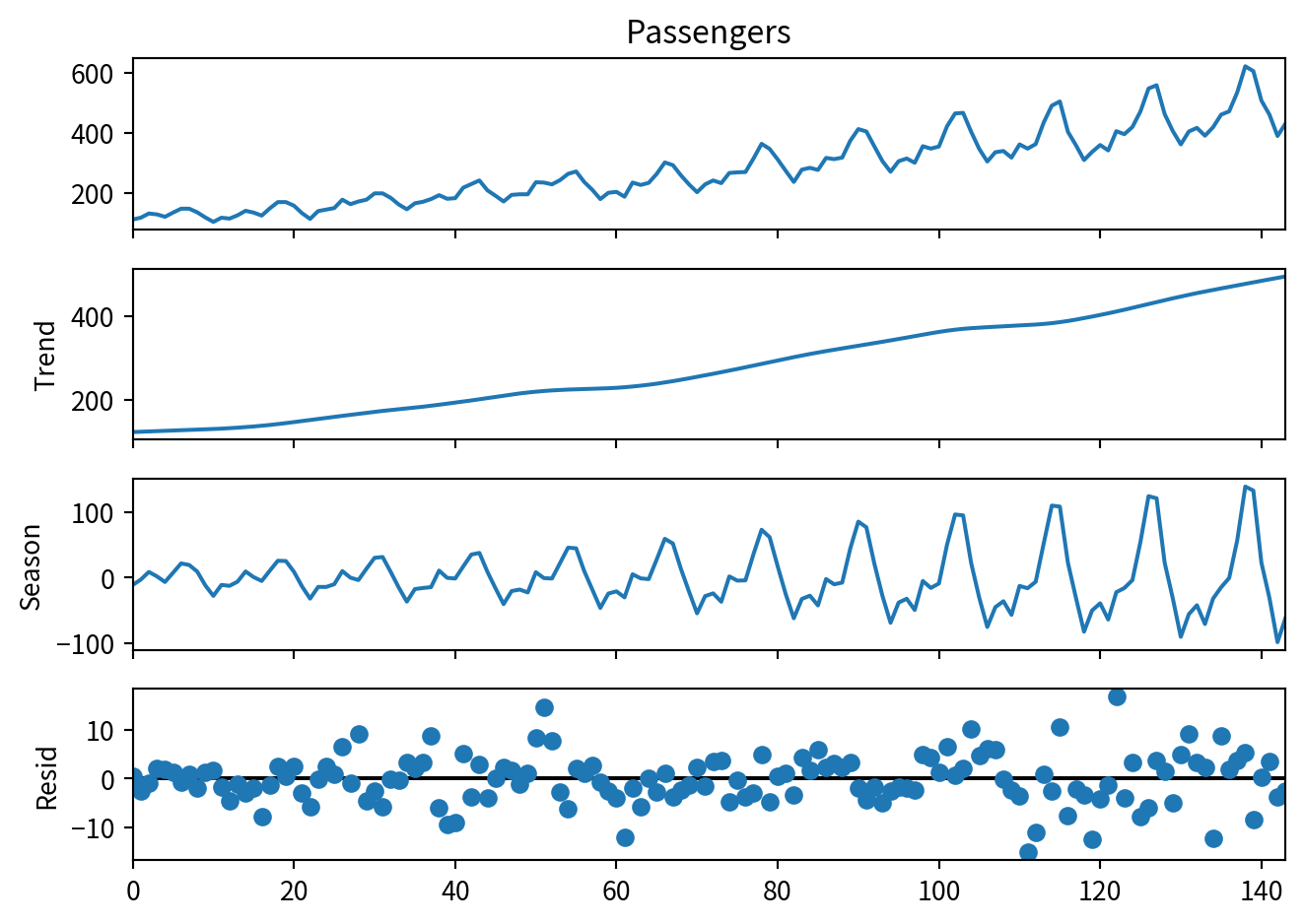 decomposition = STL(df['Passengers'], period=12).fit()