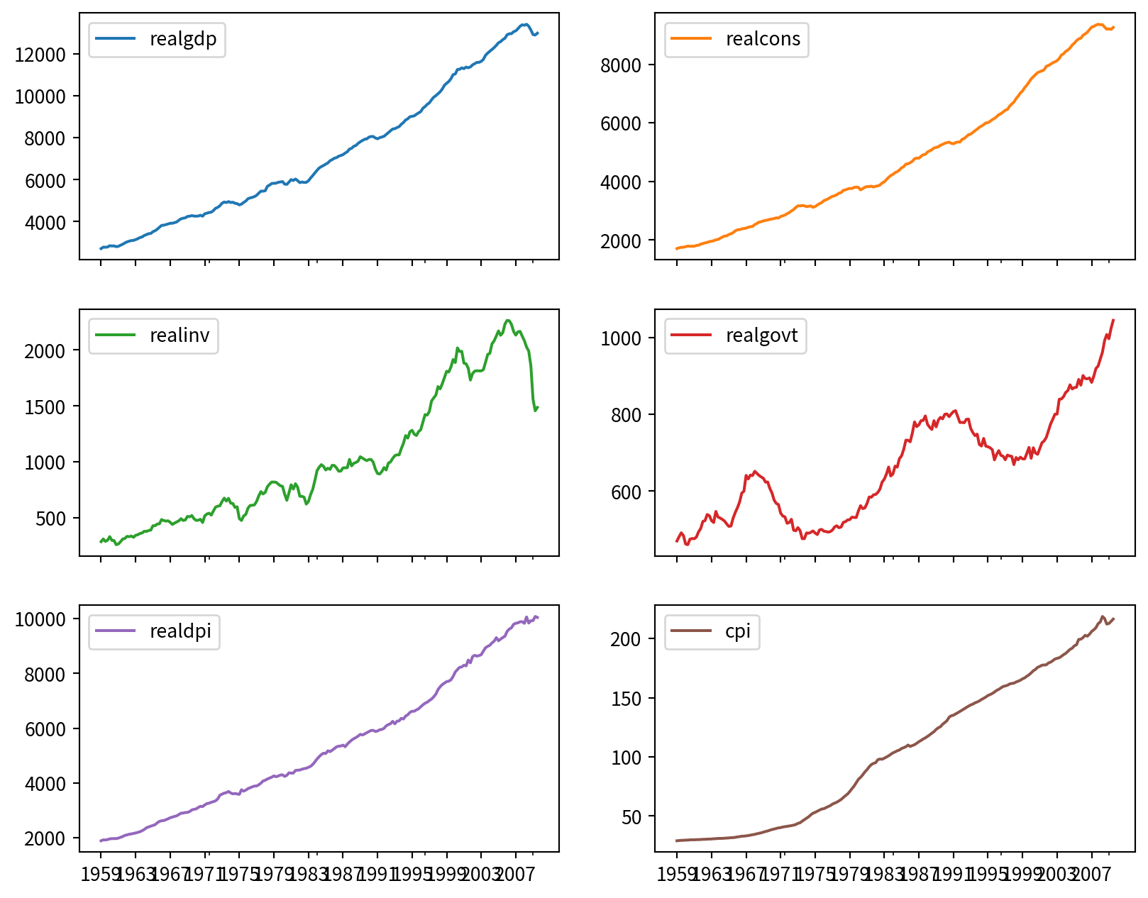 target = macro_econ_data[['realgdp', 'realcons', 'realinv', 'realgovt', 'realdpi', 'cpi']]