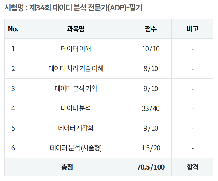 adp 필기시험 34회차 결과가 나왔습니다. 당연히 합격했고요. 제가 말했죠? 서술형을 몰라도 객관식을 70개 이상 맞추면 합격이라고요. 저는 69개를 맞췄지만 말입니다. 하하.