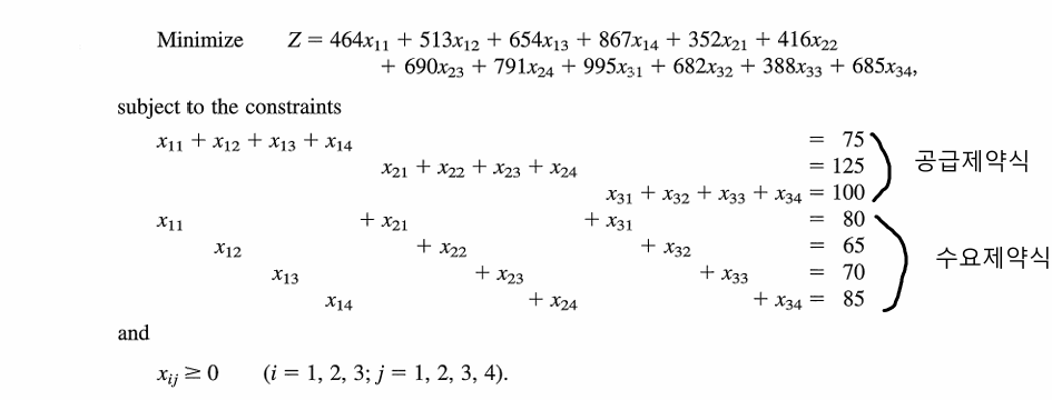 - 공급 제약식: \(\sum_{j=1}^{n} x_{ij} = s_i \quad \text{for } i=1,2,\ldots,m\)
