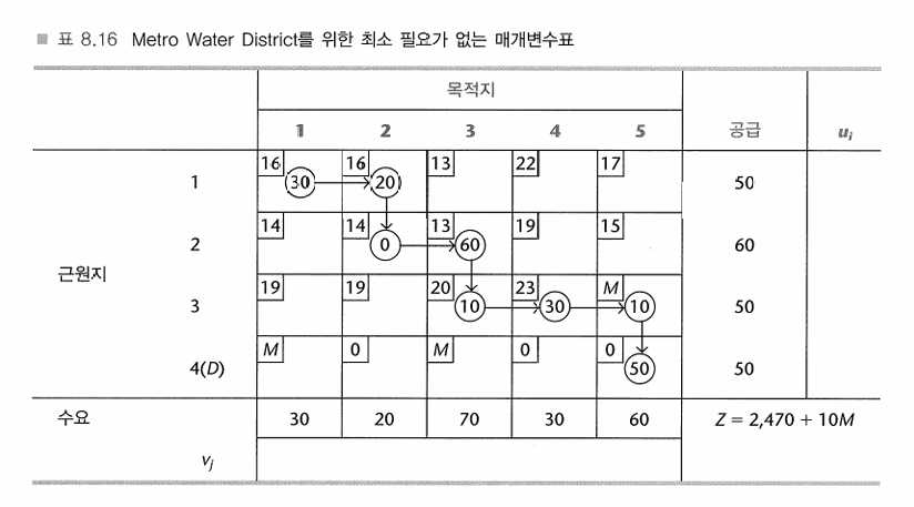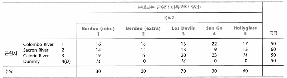 - 새 기저가능해를 결정하라: 탈락변수의 값을 각 수신셀의 할당에 더하라. 그 값을 각 기증 셀의 할당에서 빼어라.