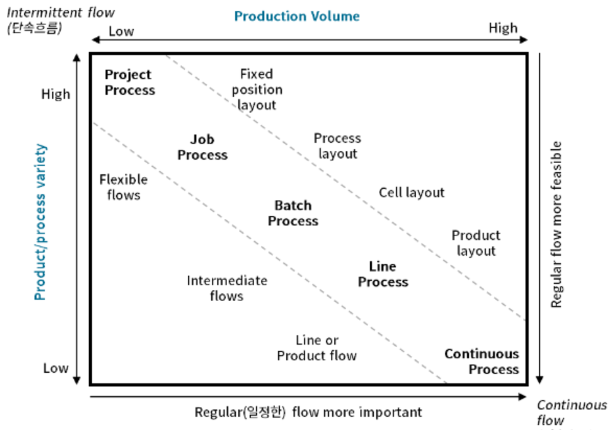 - 개별작업 프로세스(job shop): 공정별 배치. 높은 유연성, 낮은 규모