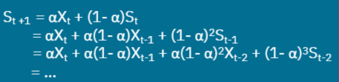 - \(\hat{y_{t+1}} = αy_t+ (1-α)\hat{y_t} = \hat{y_t} + α(y_t - \hat{y_t}\)
