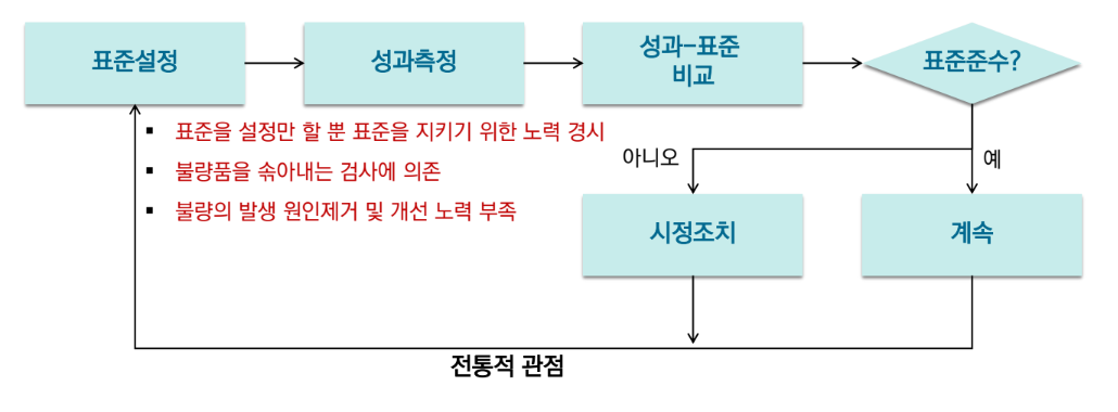 전통적 관점(QC):- 표준을 설정할 뿐 지키기 위한