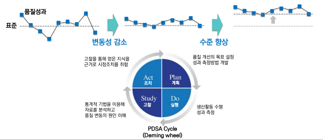 통계적 품질관리(SQC)의 시조. 품질 변동의 원인을 우연원인과 이상원인으로 구분 - W. E. Deming: PDMA 사이클