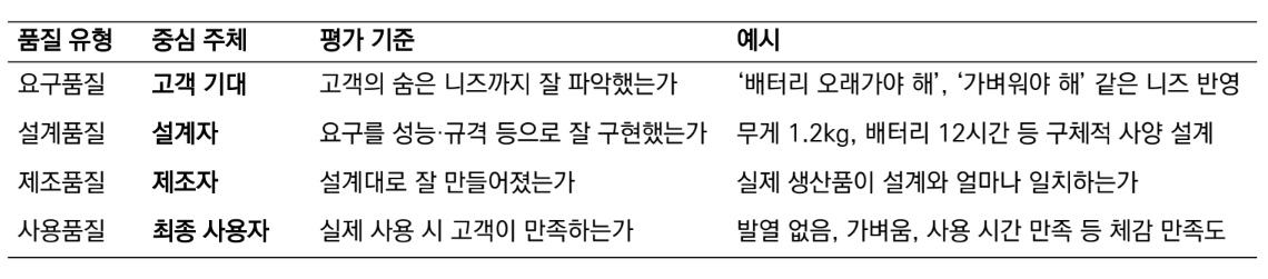 요구품질: 시장에서 요구되는 품질.정성적(시장조사, 경쟁제품 분석)인 방법으로 파악설계품질: 파악한 고객요구를 설계 언어로 잘 변환했는지제조품질: 설계된 사양을 실제로 잘 구현했는지정량적인 방법으로 파악사용품질: 고객이 실제로 느끼는 품질. 만족도