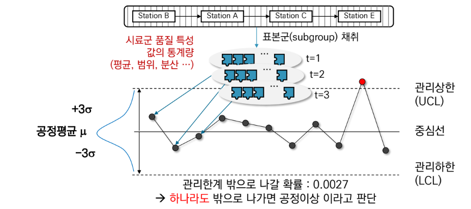 - 불량을 탐지하는 것이 아니라, 공정이 안정상태에 있는지 없는지를 선행적으로 판단하여 불량 발생을 예방하는 것