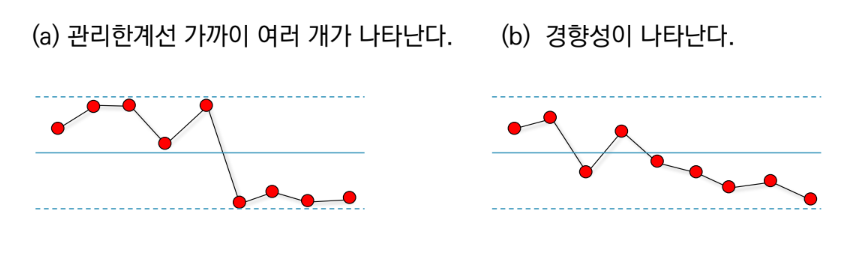- 관리도의 점들이 관리한계선을 벗어나지 않는다.