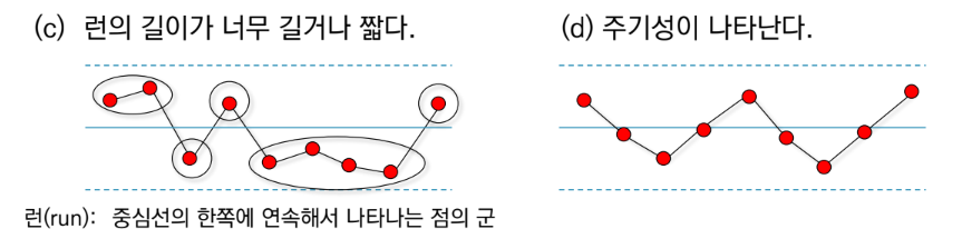 - 주기성이 나타난다: 주기적 변동 요인(환경 변화, 작업자 능률 변화 가능성)