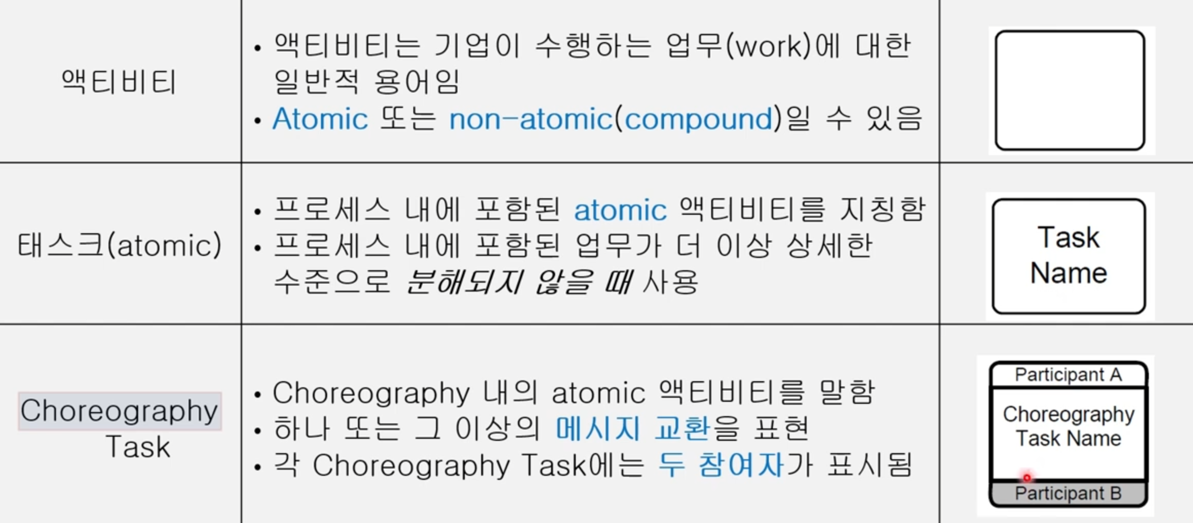 - Task: 단일 단위 작업 - Sub-Process: 여러 작업을 포함하는 복합 작업. + 아이콘 - Collapsed: 내부 상세 내용 숨김 - Expanded: + 누르면 나오는 거 - Collapsed Sub-Choreography - Expanded Sub-Choreography