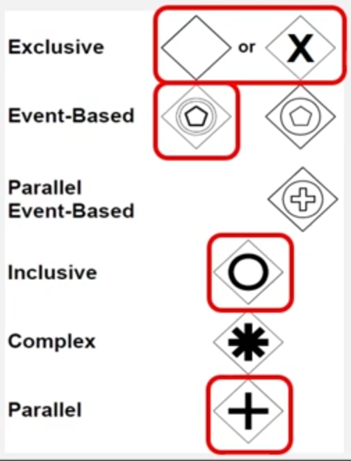 - And, Or, Xor - Event-based: event가 연결된 여러 경로 가운데 하나만 배타적으로 활성화 - branching, forking, merging, joining