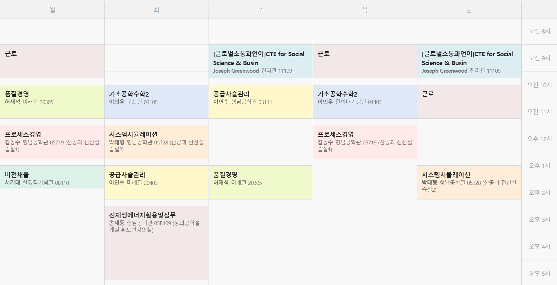 이번 학기는 온라인 강의 없이 21학점을 다 채워서 들었다. 일부러 그런건 아니고, 그냥 수강신청을 실패해서 어쩔 수 없이 그렇게 됐다. 가끔씩 점심 먹는 시간이 애매했다는 점만 제외하면 그래도 꽤 할만 했었다. 물론 두번 다시 이런 학기를 맞이하고 싶지는 않다.
