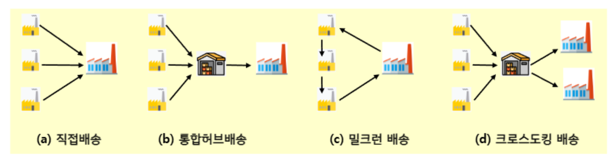 - 크로스도킹 배송: 중간 허브에서 공급 물량과 시간에 적절히 배송될 수 있도록 재분류하여 배송