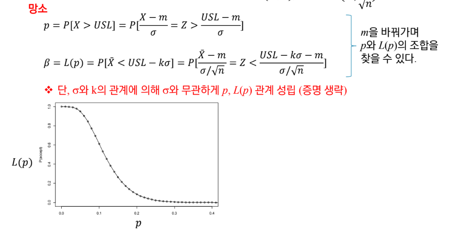 - OC 커브: 로트의 실제 불량률이 p라고 할 때, 로트의 합격 확률을 나타내는 곡선