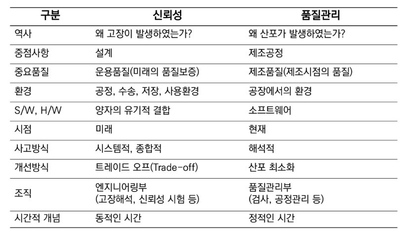- 신뢰성과 품질경영: 과거 품질 관리는 공정중심의 관리와 사후 관리에 치중되었으나, 신뢰도 공학은 사전예방 시스템으로 고장 발생 확률을 미리 예방하기 위해, 사전 시스템 공학적 품질경영을 추구