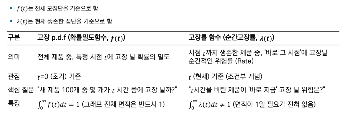 - 고장률 함수 λ(t): 시점 t까지 생존한 제품이 아주 짧은 다음 시간 내에 고장 날 순간적인 비율