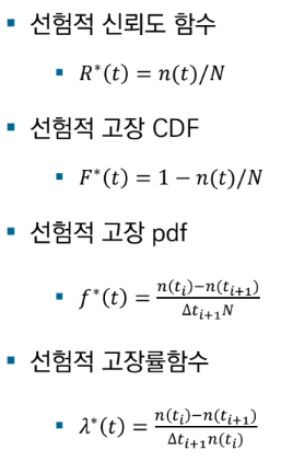 - 신뢰도 함수 R(t): 제품이 t 시점까지 고장이 나지 않을 확률