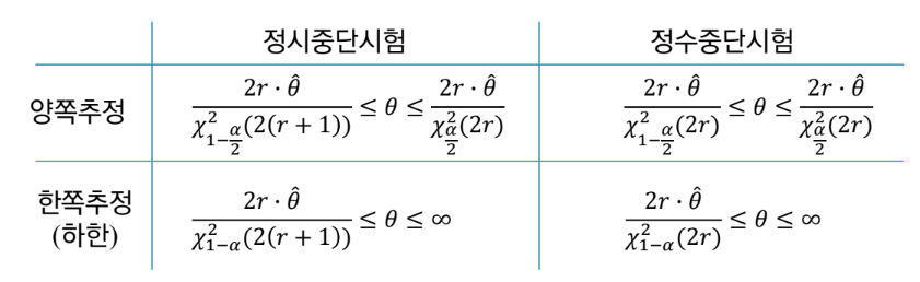 - r = 0일 때: 정수중단시험은 계산 불가, 정시중단시험의 평균 추정치는 ∞, 신뢰구간은 \(-\frac{T}{lnα} ≤ θ ≤ ∞\)
