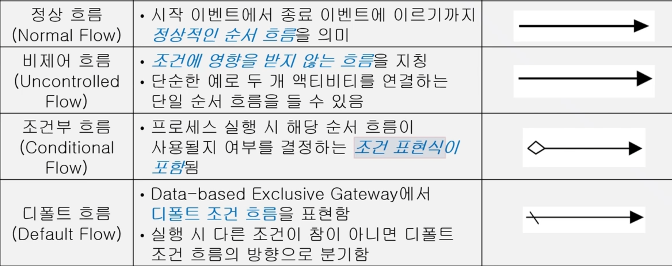 Gateway - And, Or, Xor - Event-based: event가 연결된 여러 경로 가운데 하나만 배타적으로 활성화 - branching, forking, merging, joining