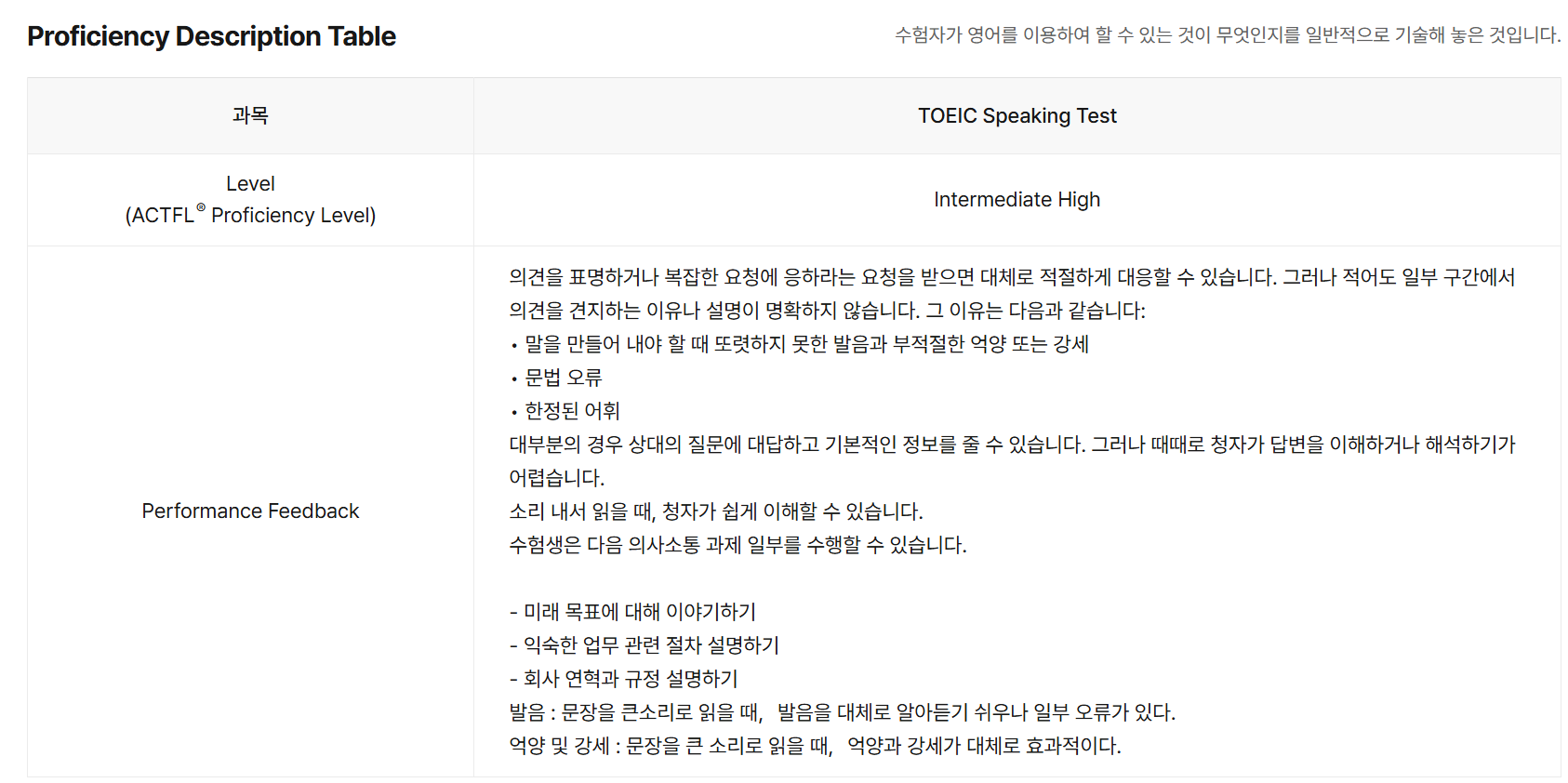 말을 만들어 내야 할 때 또렷하지 못한 발음과 부적절한 억양 또는 강세: 템플릿이 아닌 문장은 말을 뭉뚱그려서 한다는 점을 지적한것 같다. 내가 그랬나?문법 오류: 수능 영어 이후로 영어 문법을 공부해 본 적이 없다. 애초에 100% 완벽한 문법을 구사할 수 있으리라곤 생각조차 안했다.한정된 어휘: 이 부분은 템플릿 티가 많이 났다는 지적이 아닐까 생각한다.발음, 억양 및 강세: 전체적인 톤과 발음은 괜찮다고 평가해주는 것 같다. 진짜로 내 발음이 괜찮다기 보단 그냥 평가를 좀 후하게 해준거 같다.