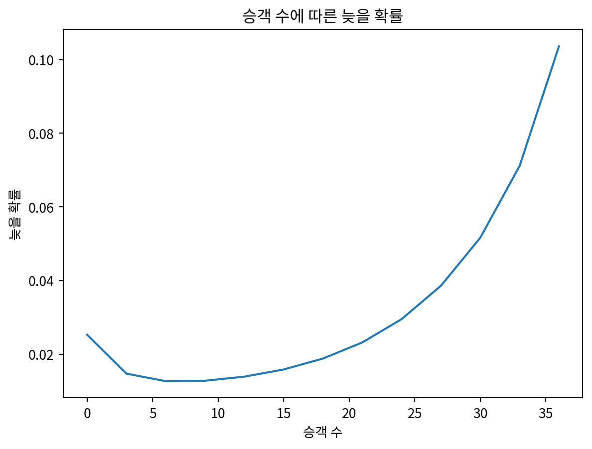 Text(0.5, 1.0, '승객 수에 따른 늦을 확률')
