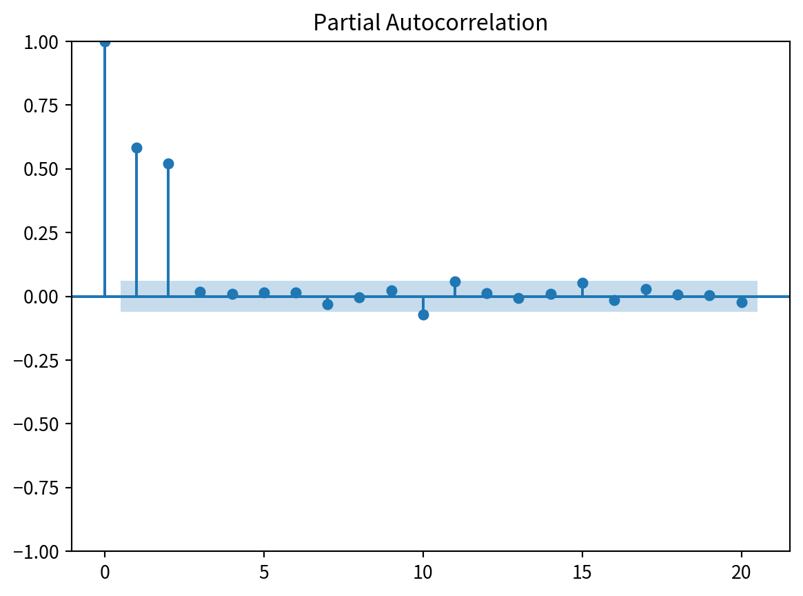 AR2_process = ArmaProcess(ar2, ma2).generate_sample(nsample=1000)from statsmodels.graphics.tsaplots import plot_pacf
